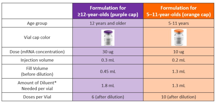 However, this reduced dose of the Pfizer vaccine for young children will need to be repackaged, requiring not just a lower dose schedule, but also ensuring that it contains a different buffer, allowing for longer refrigeration at higher temperatures (see graphic below). This can be stored at a refrigerator temperature of 2-8 Celsius for up to 10 weeks.